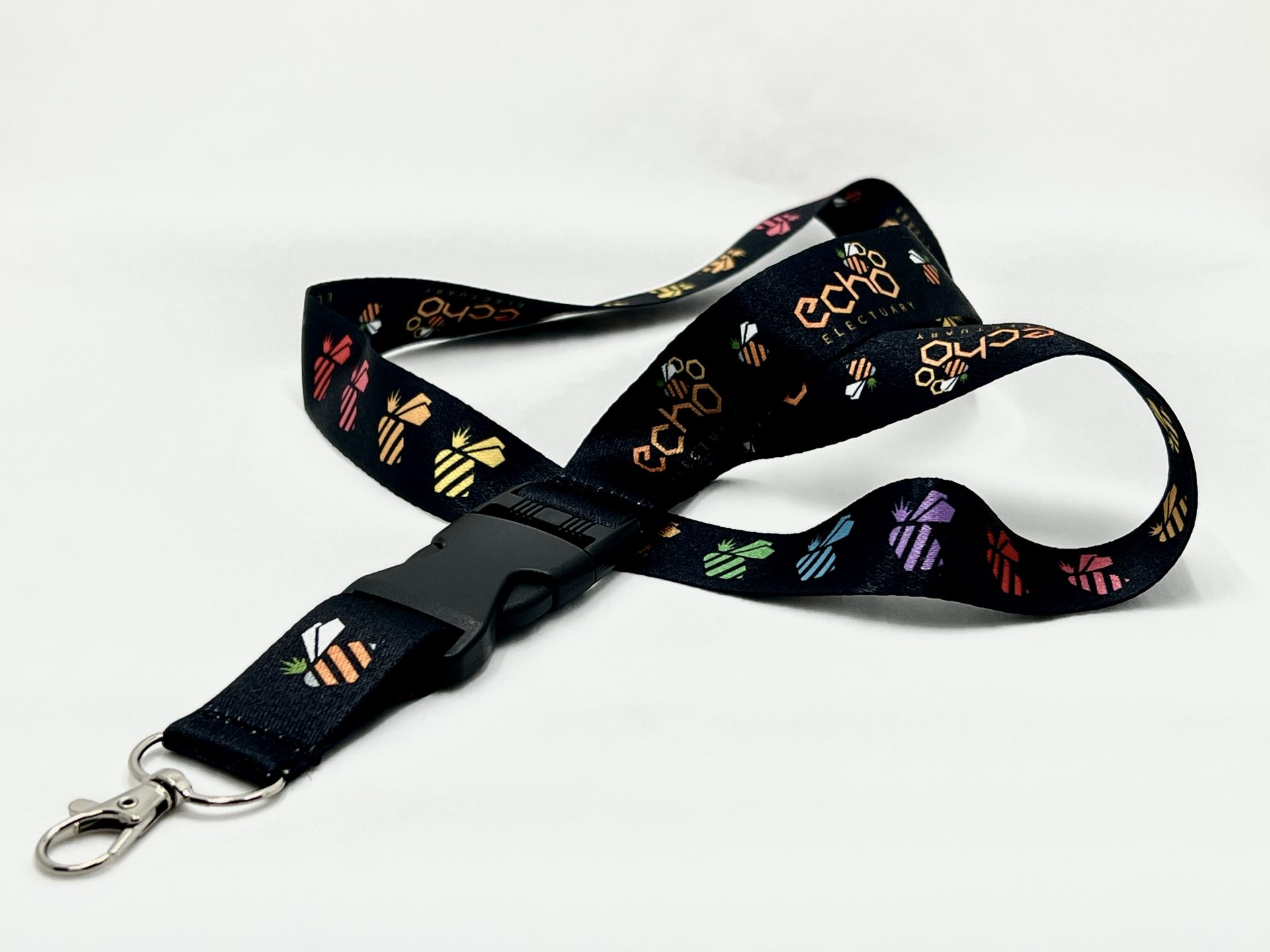 Keep your keys harnessed with this black Echo lanyard styled with rainbow bee pattern & featuring a quick clip detachable key ring clasp.