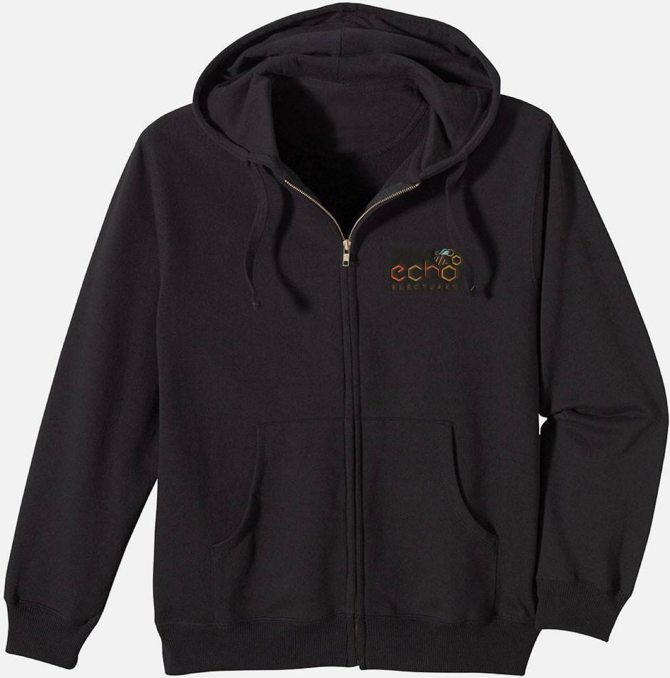 Black hooded sweatshirt with a full zipper, full color embroidered Echo Electuary logo front left chest and full color screen printed bee back right lumbar.